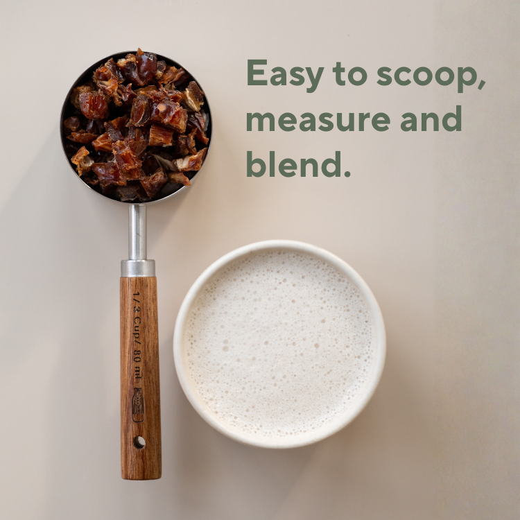 Nous avons testé des dizaines de variétés de dattes et trouvé celle qui se mélange le plus proprement, pour un lait végétal doux et naturellement sucré.