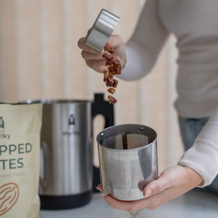 Nous utilisions des dattes entières pour sucrer notre lait végétal, mais elles étaient collantes, difficiles à doser et se mélangeaient mal.